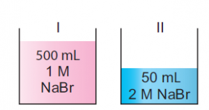 Yukarıdaki kaplar aynı ortamda olup,  I. kapta 1 M 500 mL, II. kapta 2 M 50 mL NaBr çözeltileri bulunuyor.