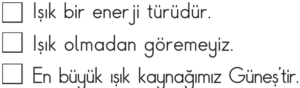 Yukarıda ışık ile ilgili verilen bilgilerin doğru olup olmadığı işaretlenmiştir.