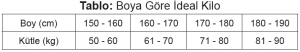 Yukarıda verilen tabloda kadınların boylarına göre olması gereken ideal kiloları gösterilmiştir.