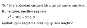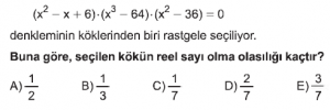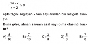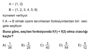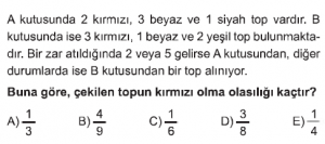 Olasılık konusu AYT Matematik dersi test çöz sayfasındasın. Olasılık Konusu test için her sorunun 1 dakika süresi vardır. Aşağıdaki Olasılık konusu AYT Matematik dersi testini belirtilen süre içerisinde çözdükten sonra en aşağıda bulunan "cevapları kontrol et" butonuna tıklayarak Olasılık Konusunda yaptığın doğru - yanlış sayısı, cevaplar ve aldığın puanı görebilirsin.