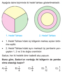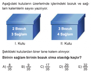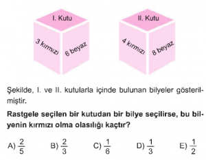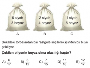 Olasılık konusu AYT Matematik dersi test çöz sayfasındasın. Olasılık Konusu test için her sorunun 1 dakika süresi vardır. Aşağıdaki Olasılık konusu AYT Matematik dersi testini belirtilen süre içerisinde çözdükten sonra en aşağıda bulunan "cevapları kontrol et" butonuna tıklayarak Olasılık Konusunda yaptığın doğru - yanlış sayısı, cevaplar ve aldığın puanı görebilirsin.