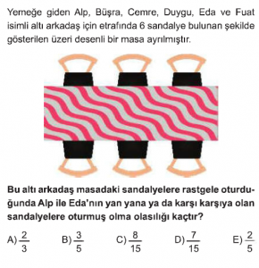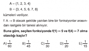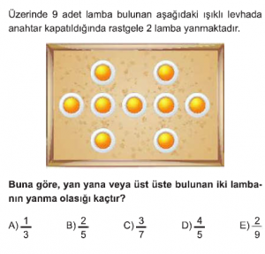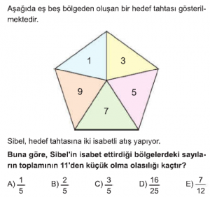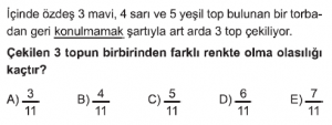 Olasılık konusu AYT Matematik dersi test çöz sayfasındasın. Olasılık Konusu test için her sorunun 1 dakika süresi vardır. Aşağıdaki Olasılık konusu AYT Matematik dersi testini belirtilen süre içerisinde çözdükten sonra en aşağıda bulunan "cevapları kontrol et" butonuna tıklayarak Olasılık Konusunda yaptığın doğru - yanlış sayısı, cevaplar ve aldığın puanı görebilirsin.