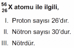 Atomun Yapısı konusu TYT Kimya dersi test çöz sayfasındasın. Atomun Yapısı Konusu test için her sorunun 1 dakika süresi vardır. Aşağıdaki Atomun Yapısı konusu TYT Kimya dersi testini belirtilen süre içerisinde çözdükten sonra en aşağıda bulunan "cevapları kontrol et" butonuna tıklayarak Atomun Yapısı Konusunda yaptığın doğru - yanlış sayısı, cevaplar ve aldığın puanı görebilirsin.